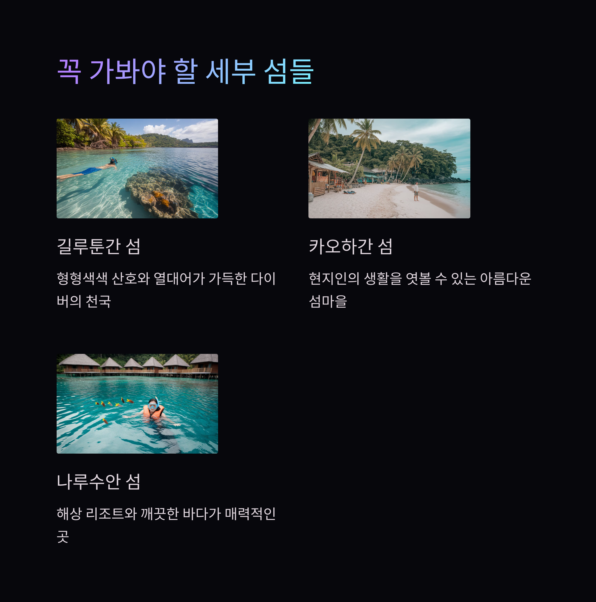 | 소규모 여행자에 적합, 일정 제약 존재 | 가족, 커플에 적합, 준비 부담은 있음 | 다양한 해양 생물, 맑은 바다, 길게 이어진 백사장 |